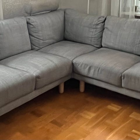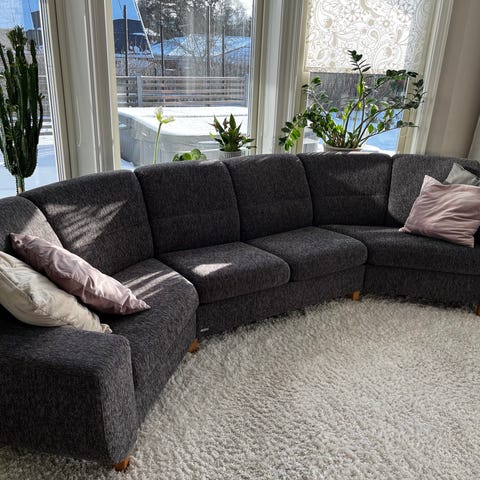 Hörnsoffa 7 sits med en schäslong. Märke Scapa. Grå.