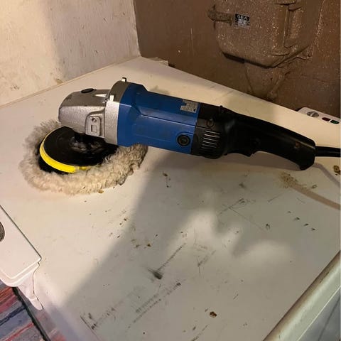 HBM 200 Profi polermaskin i bänkmodell. Maskinen är blå och är avsedd för polering och efterbearbetning av olika material med polerskivor monterade på båda sidor. Lämplig för verkstad, hobbybruk och finbearbetning av metall och andra hårda ytor. Drivs via strömbrytare på fronten och ska användas enligt säkerhetsanvisningarna på maskinens typskylt.