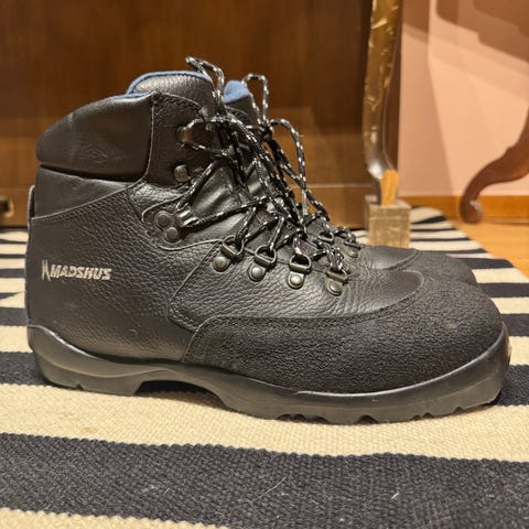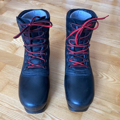 Pjäxorna är väl använda men mycket väl omhändertagna. De har smorts in regelbundet, både före och efter användning. Lädret är mjukt och i gott skick, sulorna hela och funktionella. Normalt slitage syns men inget som påverkar funktionen.