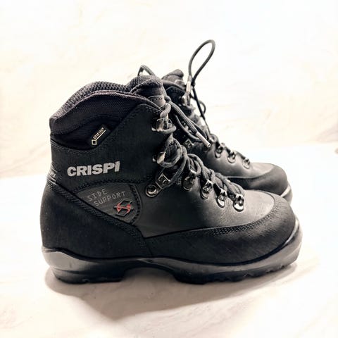 Rejäla och varma turskidpjäxor från Crispi, modell Nevada BC med Gore-Tex-membran. Storlek 47 med bred läst – mycket bekväma även för dig som behöver lite mer utrymme i framfoten.