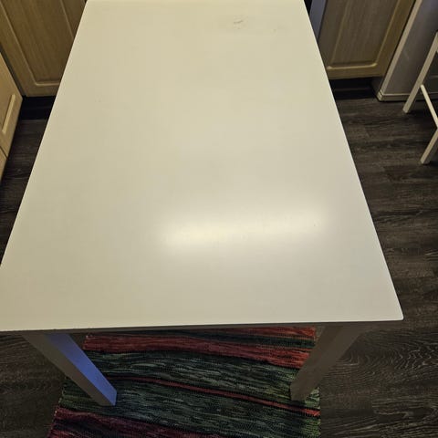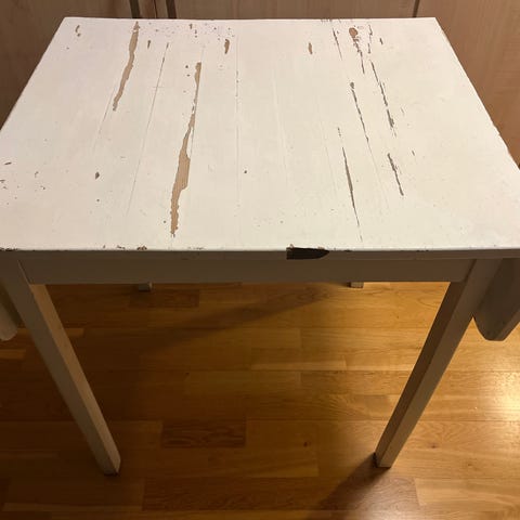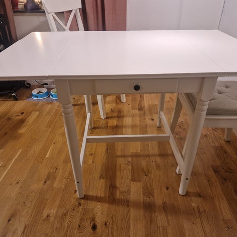 Stabilt, vitt matbord med klaffar. Bra skick, några små färgavskav finns (se bilderna). Bredd 77 cm, längd utan klaffar 63 cm. Klaffarna är 29 cm. Hämtas i Visby, ta med bärhjälp.