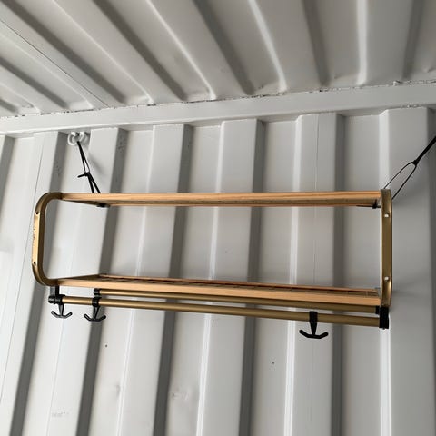 Isaksson hatthylla i metall med gallerkonstruktion.
