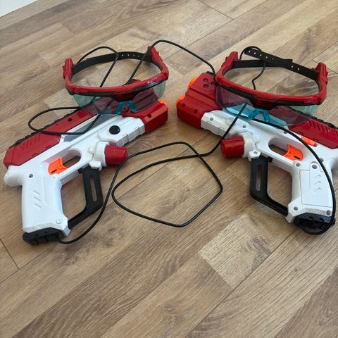 Två Space Blaster laser tag-pistoler. Varje pistol har ljus- och ljudeffekter. Den har sensorer som känner av när man blir träffad,