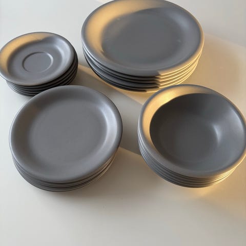 6 stycken av varje, runda, djupa,små- assieter , kaffekoppar, samt en stor oval tarllrik