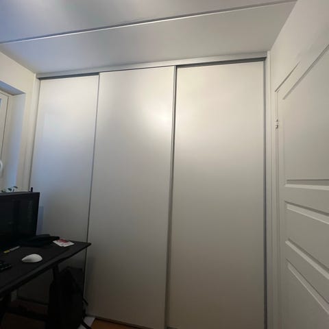 Priset gäller hela garderoben med inredning och dörrar som syns på bilden. Väldigt gott skick och har efter flera års trogen tjänst några enstska skavanker på färger på ett fåtal av lådorna och hyllplanen.