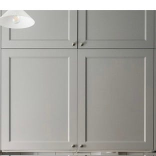 Köksbänk med vit, blank front och bänkskiva i trä. Passar i kök eller pentry som arbetsyta eller förvaringslösning. Den träfärgade skivan ger en varm kontrast mot den vita fronten och lämpar sig för matlagning eller som avställningsyta.