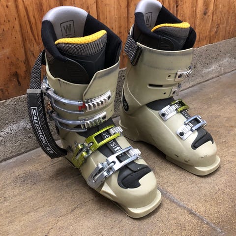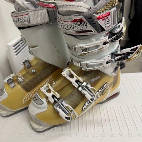 Pjäxor med fyra spännen och powerstrap upptill.