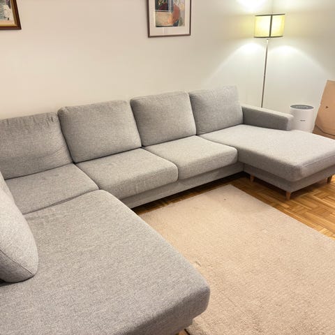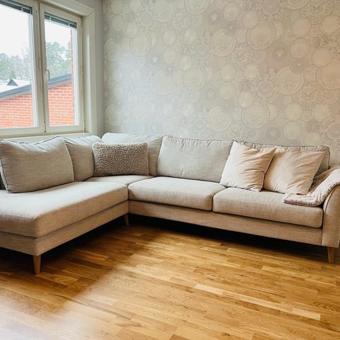 IKEA hörnsoffa i ljusbeige tygklädsel. Soffan har schäslongdel på ena sidan och rak avslutning med armstöd på den andra sidan. Rygg- och sittdynor är lösa och klädda i samma tyg som stommen. Soffan står på mörka ben som ger viss markfrigång under möbeln. Passar som större sittmöbel i vardagsrum med plats för flera personer att sitta eller ligga.