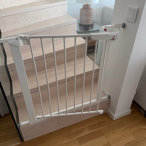 Troll Security säkerhetsgrind i vitt trä. Grindens delar består av vertikala träspjälor samt sidoprofiler och monteringsbeslag. Medföljer gör skruvar, fästen och övriga monteringsdetaljer enligt bruksanvisning. Avsedd för att fungera som säkerhetsgrind, exempelvis i dörröppningar eller liknande passager där avgränsning behövs. Aldrig uppsatt.