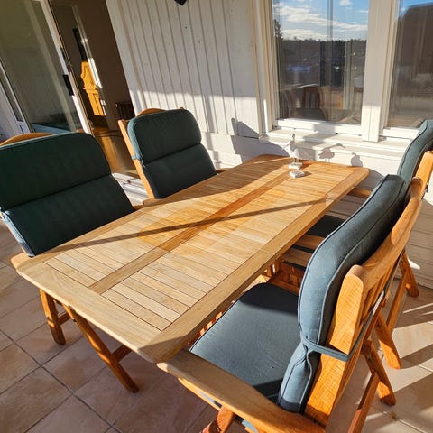 Hillerstorp matgrupp för utomhusbruk i trä.