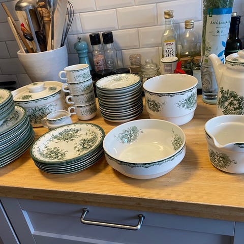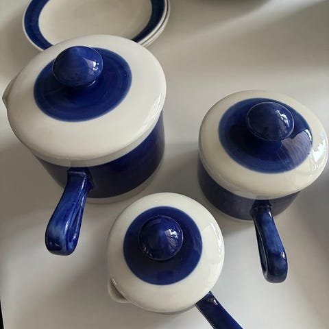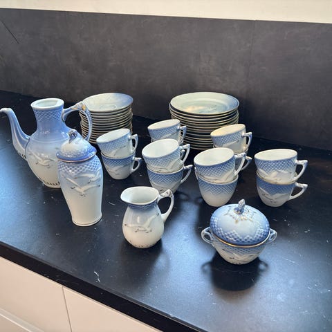 Nittsjö Sweden porslinservis i blått. Servisen består av flera delar i samma färg och stil, bland annat tallrikar, fat, koppar, tekanna, skålar, glöggmuggar och en glöggkanna. Alla delar är i glaserat porslin/keramik med stämpling Nittsjö Sweden undertill. Passar som komplett mat- och kaffeservis i hemmet eller som samlarservis från Nittsjö.