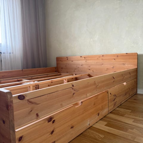Allt är i fint skick men finns lite småmärken på ramen. Saknas en plastpigg som inte har någon påverkan på funktionen, går säkert fixa som reservdel från IKEA om det skulle behövas.