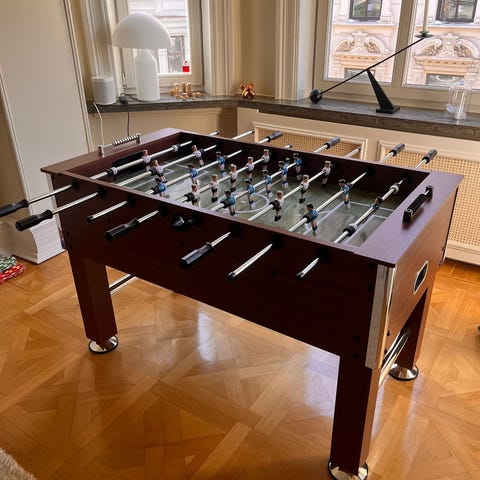 Cougar bordfotbollsspel i svart utförande. Stabil konstruktion med ben i trä eller träkomposit och spelplan i grön färg med markerade linjer. Utrustad med flera spelstänger med spelare i två lag, manuella räkneverk på sidorna samt bollutkast. Passar för inomhusbruk i hem, fritidsrum eller liknande miljöer.