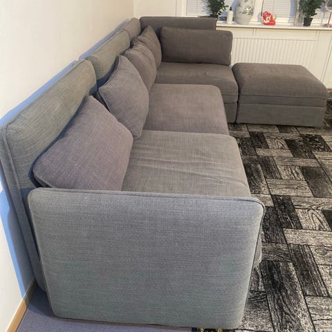 Stor soffa där det ryms många. 3 meter bred, divan 2 meter. Sittpuff hänger med!