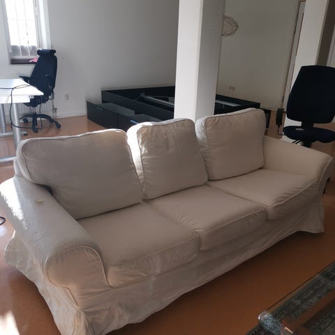 Fläck på ena sittdynan. Klädsel avtagbar och kan kemtvättas. Har inte försökt få bort fläcken.