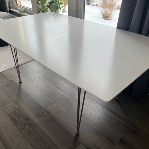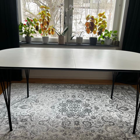 Stort köksbord med metallben. Oval laminatskiva 240x110cm. Laminaten har släppt längs ena långsidan, kan förmodligen limmas. Syns inte om man inte lyfter laminaten som jag gör på bilden. Finns i södra Hagby 2 mil söder om Kalmar.