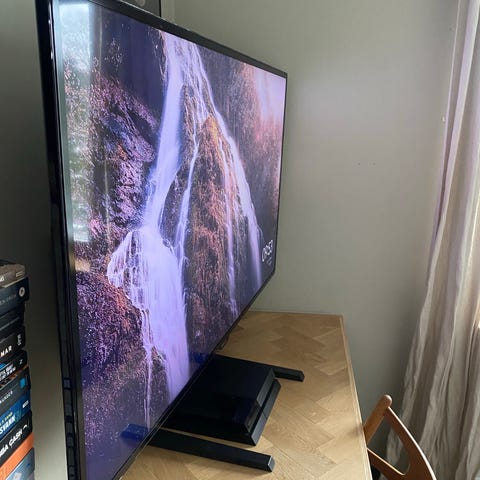 Samsung curved smart tv . Tv:n har flera anslutningar på baksidan, bland annat HDMI och USB-portar samt nätverksanslutning. Den står på ett bordsstativ och kan även användas med väggfäste om sådant finns. Passar för vanlig tv-tittande och anslutning av externa enheter som mediaspelare och spelkonsoler.