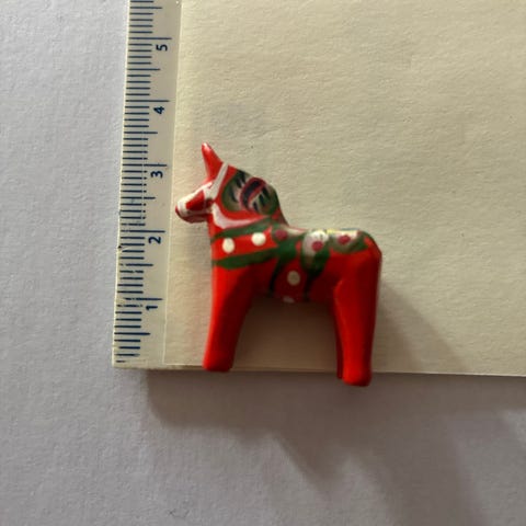 Trähäst leksak på hjul i vit färg med röd sits. Hästen är utformad som en ridleksak för barn och har hjul framtill och baktill för att kunna rullas framåt. Passar som leksak eller som dekorativ inredningsdetalj i barnrum eller hem med vintagekänsla.
