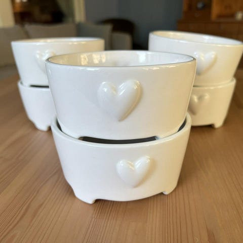 Set med fyra vita muggar, var och en dekorerad med två röda hjärtan.