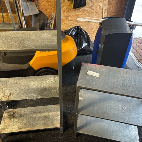 Metallhyllor för förvaring med flera plan. Hyllorna är öppna och lämpar sig för exempelvis garage, förråd eller verkstad. Konstruktion i metall ger tålig och lättskött yta. Passar för förvaring av verktyg, lådor eller annan utrustning inomhus.