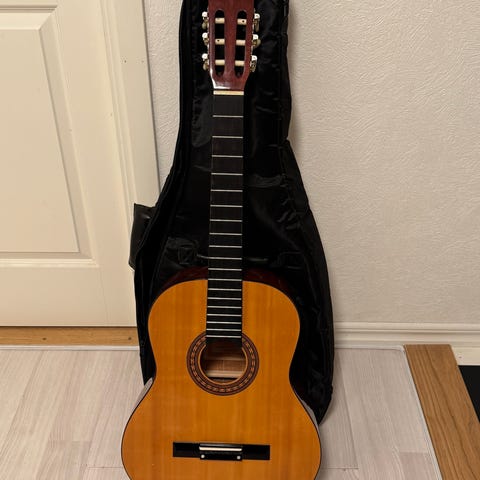 Klassisk akustisk gitarr i svart färg. Gitarren har nylonsträngar, traditionell resonanslåda med dekor runt ljudhålet och mekanik med öppna stämskruvar. Kroppen är lackad i svart och utrustad med remknopp i nederkant.