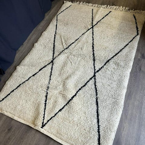 En autentisk Beni Ourain-matta från 1950-talet, handvävd i 100 % ull av kvinnor i Atlasbergen. Den tjocka, mjuka luggen ger en varm och ombonad känsla, medan de rena geometriska mönstren speglar den tidlösa estetik som gjort dessa mattor så eftertraktade.