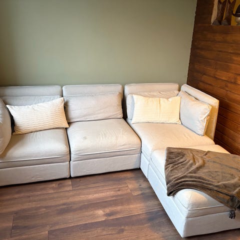 Varsamt använd och i mycket bra skick. Inga fläckar eller skador. Tillhörande fotpall ingår.