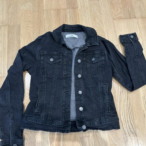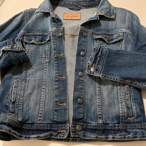 jeansjacka i blå denim för dam i storlek M. Jackan har knäppning framtill med metallknappar, två bröstfickor med lock och knapp samt långa ärmar med manschett. Passar som vardagsjacka eller ytterlager under mildare väder.