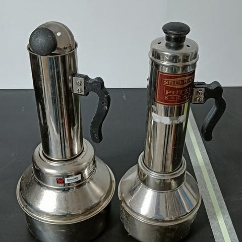 Rostfritt utförande med vita handtag.