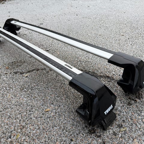 Porsche takräcken med tillhörande förvaringsväska. Takräckena består av två tvärbalkar i metall med svarta plastfästen. Förvaringsväskan är i svart tyg med bärhandtag och Porsche-logotyp. Lämpliga som lastsystem på bil, exempelvis för montering av takbox eller annan last.