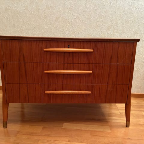 Skåp i teak i ok beg skick. Vissa färg nyanser finns, se bilder. Mindre repor och bruksspår finns, se bilder för största märkena. Överlag en fin möbel.