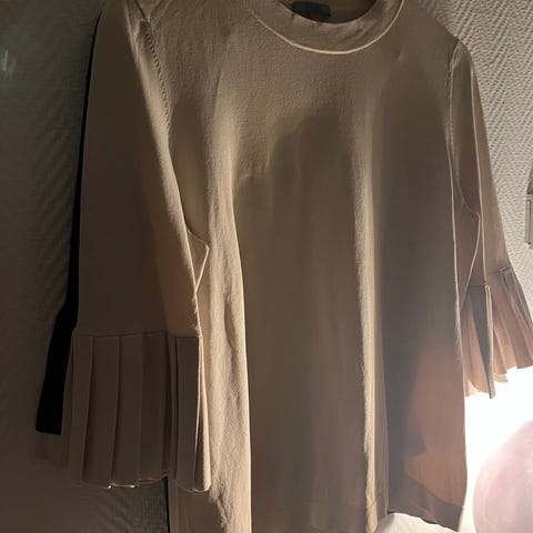 COS tröja för dam i storlek M. Mörk marinblå i färg bomullstyg med rund halsringning. Ärmarna är trekvartslånga med plisserade volangdetaljer och kontrasterande ljus kant nedtill. Passar till vardag och enklare festliga tillfällen.