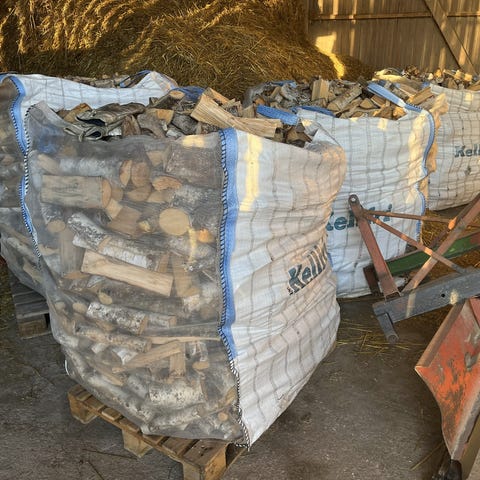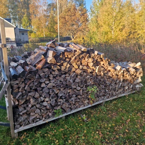 Blandved, mestadels gran kapad och klyvd i 30cm längder.