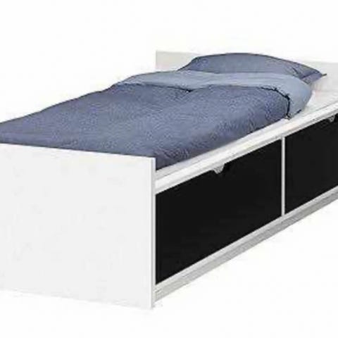 IKEA säng med förvaring i vit färg. Sängen har en rak huvudgavel och utdragslådor undertill som ger extra förvaringsutrymme. Passar som enkelsäng i sovrum, gästrum eller barnrum. Madrass, täcke och kudde kan ingå eller uteslutas beroende på överenskommelse.