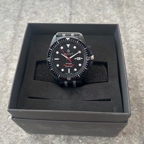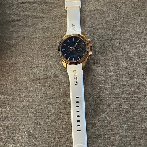 Gant herrklocka med kronograf och analog visning. Klockan har vit urtavla med tre subdials och roséguldfärgad boett. Tim- och minutmarkeringar är tydligt markerade. Urtavlan har tre tryckknappar på sidan för kronograffunktioner. Armbandet är i brunt läder med klassiskt spänne och präglad Gant-logotyp på insidan. Passar som vardags- och kontorsklocka för man.