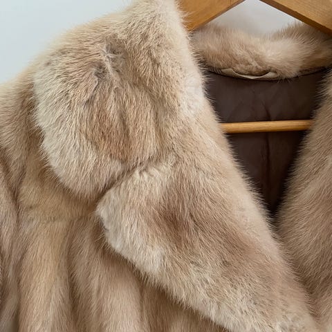Säljer mammas skräddarsydda päls i storlek M, med måtten Längd 108 cm, axelbredd 49 cm, bystmått 100 cm och längd ärmar 54 cm.