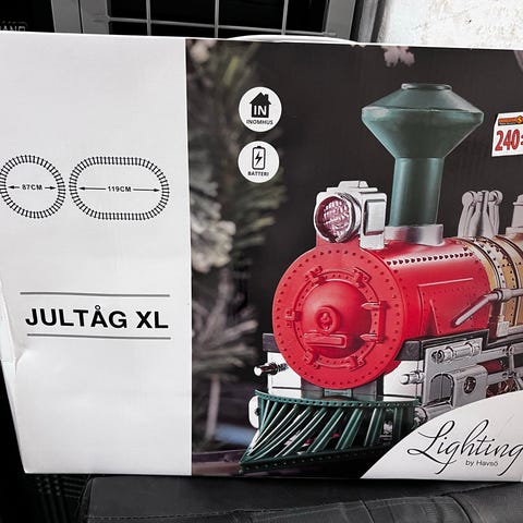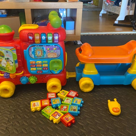 Disney lektåg i plast med tillhörande räls i flera delar. Tåget är utformat som ett åktåg där barnet kan sitta på sätet och styra med handtag och knappar på instrumentpanelen. Flera färger, bland annat rött, gult och blått. Rälsen består av raka och böjda sektioner i gult och rött som kan sättas ihop till en bana på golvet. Leksaken är avsedd för små barn som åkleksak och tågset inomhus. Har massa melodier och tutor som mina barn älskat. Passar 1-3 år.
