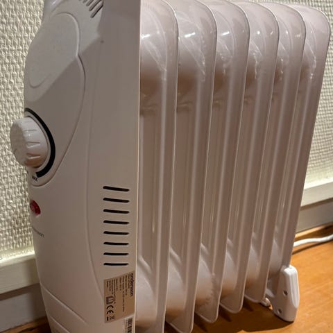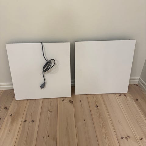 Vita väggmonterade elradiatorer i metall. Två stycken element i olika storlek med fästen på baksidan för montering på vägg. Utrustade med kabel och integrerad termostat/reglage på sidan. Passar för uppvärmning av inomhusutrymmen där elvärme önskas, till exempel i bostad, kontor, garage eller förråd.