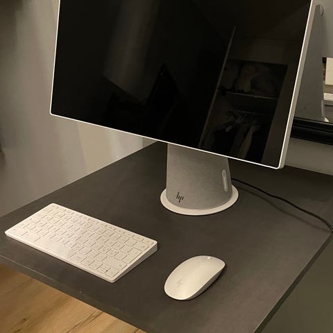 HP stationär dator all‑in‑one i vit färg. Datorn är integrerad i skärmen och levereras med matchande vitt tangentbord och vit mus. På framsidan finns märkning för AMD Radeon‑grafik och AMD Ryzen‑processor. Lämplig som skrivbordsdator för hem eller kontor där man vill ha en allt‑i‑ett‑lösning med skärm, tangentbord och mus i en enhetlig design.