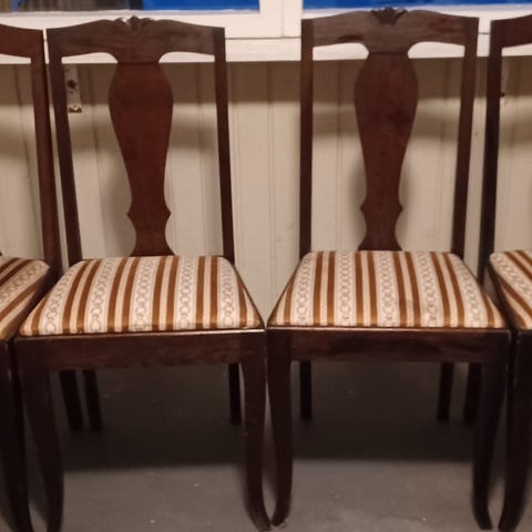 Stol i trä med brun finish och dekorerad sits. Ryggstöd med svarvade spjälor och profilerade ben. Passar som sittmöbel i exempelvis matsal, kök eller hall. Klassisk modell med hård sits och utan armstöd.