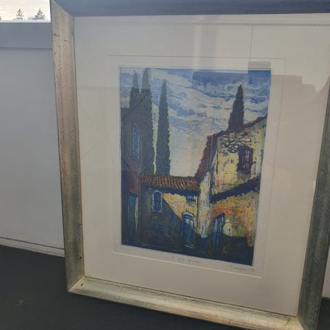 Abstrakt tavla av okänd konstnär med färgstarka motiv i rött, grönt, gult och vitt mot ljus bakgrund. Målningen är inramad med en smal guldfärgad ram. Passar som väggdekoration i exempelvis vardagsrum, sovrum eller kontor. Exakta mått och teknik är okända.