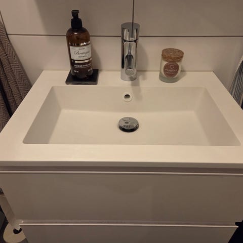 Handfatet är i fint skick men på lådorna finns två mindre slitage. Bottenventil ingår.