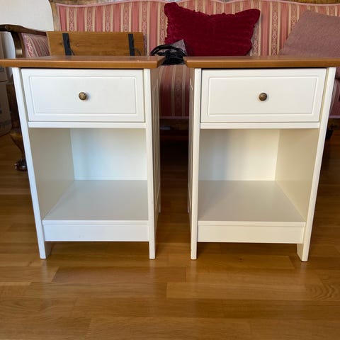Mio sängbord i vitt utförande. Varje bord har en öppen hylla samt en undersittande låda med knopphandtag. Passar som sängbord eller sidobord i sovrum eller vardagsrum. Bordens raka form och släta ytor gör dem enkla att placera mot vägg eller intill säng. Säljes som par enligt bilder.