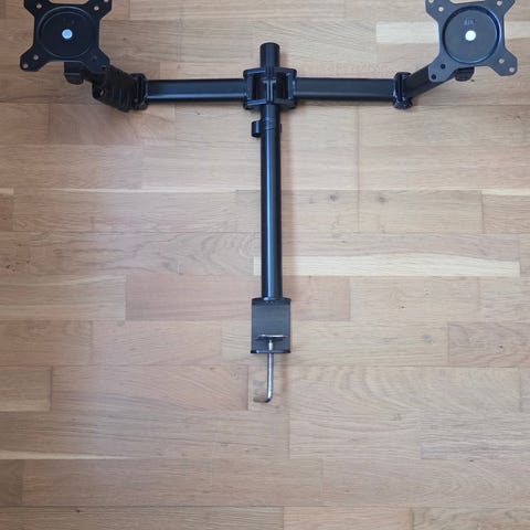 Skärmfäste för två bildskärmar upp till cirka 27 tum. Fästet monteras i bordskant med klämma och har två VESA-fästen för skärmar. Konstruktionen är i metall med justerbara armar för placering av skärmarna bredvid varandra. Lämpligt för skrivbordsmiljö där man vill använda två skärmar samtidigt.