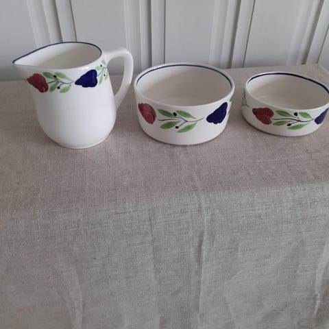 Kanna och skål i keramik med blommotiv. Setet består av en liten kanna med pip och en skål med två handtag. Båda delarna har vit glasyr med blå botten och dekor av små blå och vita blommor. Passar till servering av exempelvis mjölk, sås eller socker vid bordet eller som prydnad i kök och matsal.