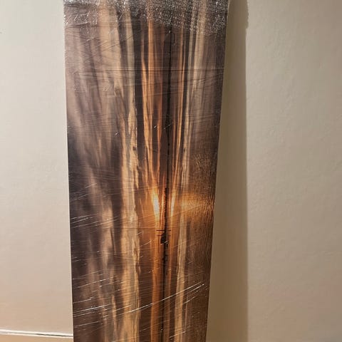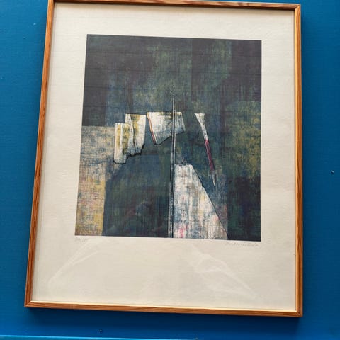 Tavla med svartvit landskapsbild föreställande en roddbåt på stilla vatten intill klippor. Motivet är inramat med passepartout och en enkel, mörk ram. Passar som väggdekoration i till exempel vardagsrum, hall eller kontor.