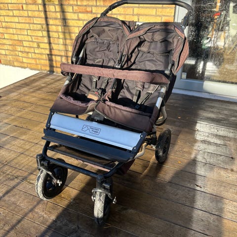 Syskonvagn/dubbelvagn Mountain Buggy Duet v 3.0. Välanvänd av oss, men kan gärna fortsätta användas av någon annan nu när storasyskonet inte längre åker vagn. Lättrullad och smidig, för att vara en dubbelvagn. Ena sufletten lagad, så den har en extra söm som den andra sufletten inte har. Varukorgen nytvättad i parfymfritt tvättmedel. Pris 1000 kr.