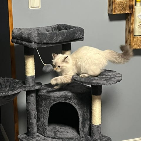 Dom har kattträd, kattlåda, transportbur, mat, leksaker som såklart följer med dom.