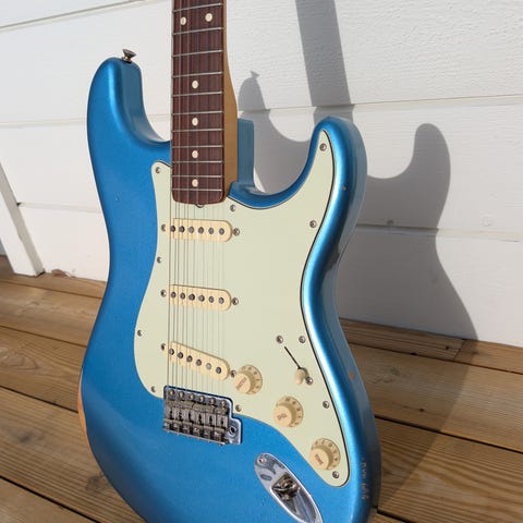 Grym gitarr. Mikar utbytta mot Lundgren Vertigo och Mojo elektronik, originalmikar finns ej kvar. I övrigt original. Ok band. U-shape. 7,25" radius. Vikt ca 3 kg. Termometer case, ashtray och COA ingår.