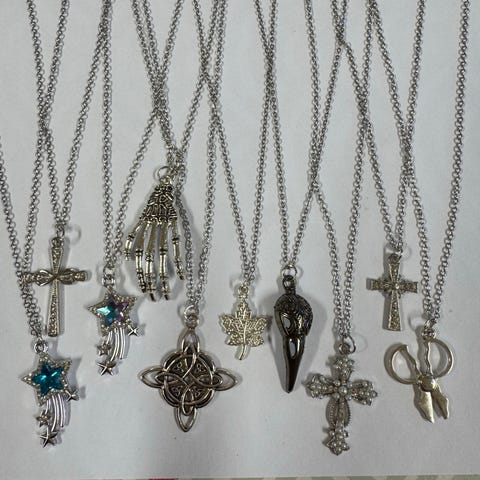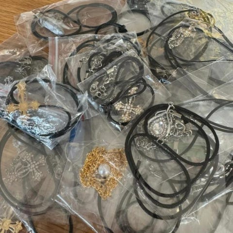 Säljer av lite halsband som jag och dottern gjort/skapat. Varje paket innehåller 10st halsband. Dom med svart halsband är 45cm , silvriga kedjor är 50cm .